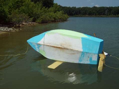 I finally got Fat Fly to the lake and capsized her. Boy is she hard to roll over, it was all I could do to dump her. She floats very high and not a drop got in the cabin. Winds were light so I didn't get to wring her out but it seems like she wants to sail very flat. Next big wind day I will knock off work in the boat shop and try her in some wind.