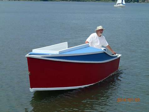 A three sheet dingy I designed and built 15 yrs ago to row/sail/motor (electric with battery in the bunk). Here are a couple of pics of the rebuilt dingy. The first tests went very well. Ben Hockley (co-op student) helped build Dianne took the pictures. I do need Dacron line to tighten the sprit but she sailed well regardless. A kayaker saw us testing her, then passed us on his return as we (three large persons) motoring up stream. he commented that it does everything, asking for a contact number and touched base with me that evening wanting plans! They are not ready yet (life's happening) but I will get to it. As I'm further along I'll write it up for you.