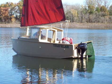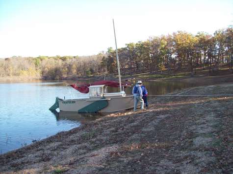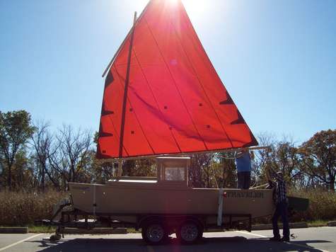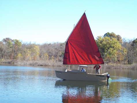 Recently the 5th annual Meangene's Halloween Hideout was held at Stockton Lake, Missouri. We had the special privilege of getting to see the splash and first sailing of the prototype Jim Michalak Jukebox 3 built by Eugene Dixon of Tulsa, OK. Technically "Traveler" had been splashed previously but only used as a motor boat then. Eugene rolled in from Tulsa with all his rigging hardware, we got the good ship Traveler dressed and ready for her first sail. We had two great days on her, the first day in light winds perfect for shaking her out. The second day winds were 18 gusting 20 mph, perfect for hard testing. She likes to roll over about 12 degrees, pick up her skirts and launch like a sprinter coming out of the blocks. Great job Eugene, you done good.