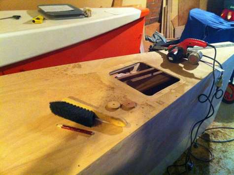 It weighs almost exactly 100 lbs, so one person can move it around or load it. It’s a bit heavy for lazy old me to car-top, but sturdier folks could go that route as well. You could definitely build it lighter if you didn’t glass virtually surface (as I did), but since it’s a prototype, I like to err on the side of durability.