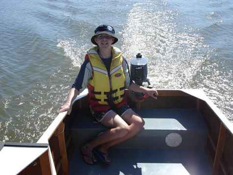 Craig has done a marvelous job of making the design come to life. So far he has tested it with a 2 HP motor, and it went quite well, pushing along at hull speed, about 4 MPH. He then upped the test to a 4 HP motor, and got the boat to plane. The estimated water speed is about 10 MPH. Craig is going to try a 6 HP motor after minor strengthening of the transom. He also reports that the boat is stable with 3 people aboard, and acts as any flat bottomed boat would in tight turns, heeling only slightly to the outside. The flat bottom design allows shallow water boating, with a loaded draft of less than 3 inches. The next thing he intends to do is set up the camper aspect of the design. He is constructing an elaborate entry door, with an opening window. This is far more than the plans call for, which is a rolled up canvas door, held in place with velcro.