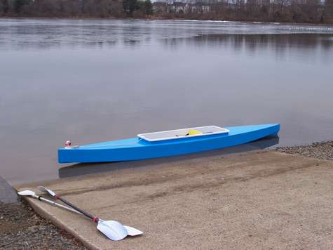 This year, because of icing at our local reservoir, the test was delayed until March 29 when some liquid water was available around the ice. Worth the wait! The enclosed pictures are of the first splash of "Beaux Eaux" (French for Beautiful Waters), a 15'9" X 28" flat-bottomed plumb-stemmed qajariaq. The cockpit is large so as to allow the occasional carrying of a grand daughter or other small passenger. Please note the distinctive mooring bitt and the clever way the painter is attached. The boat is very stable and easy to paddle.