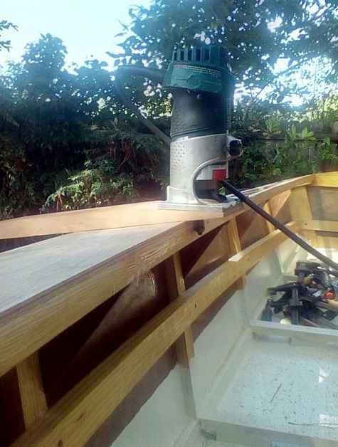 I made an auxiliary 12.5 degrees base for my Bosch router in order to trim the edges of the side decks plumb with the inwales, worked great. I used tight-grained Cherry.