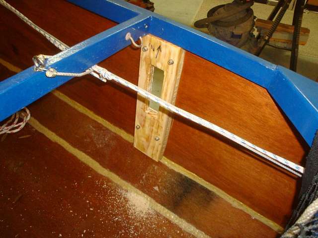Inside view of starboard side support plate showing the 4 through-bolts. This plate is snug against the bottom of the sheer clamp and the inside of the bilge panel, and is glued to both. |