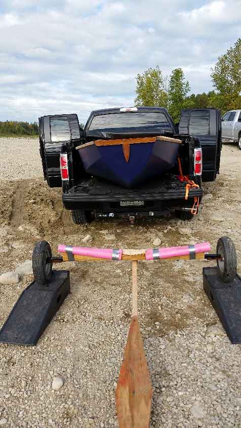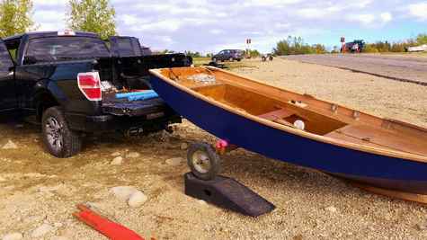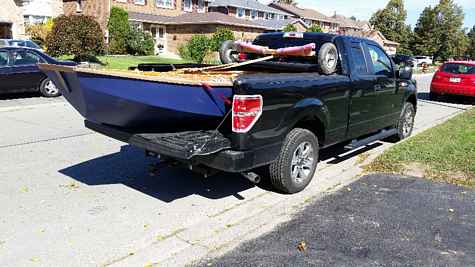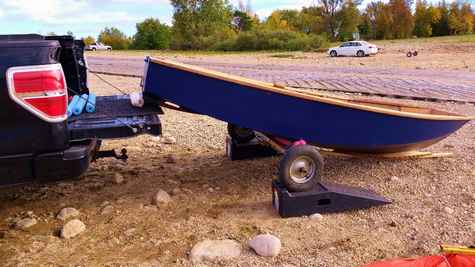 The only part I have some difficulty with is hoisting the boat from the dolly up a couple of feet to the tailgate by myself. You obviously can’t stand directly behind the boat to lift it as you’d be in between the boat and the tailgate – so you have to do it from one side. Do-able but not easy. I thought about making or buying some ramps – the type you load an ATV into a truck with but the angle was too steep to push the boat and dolly up. Then I had a little brainwave (little brain…). I borrowed a set of car ramps (the kind you use to do oil changes) from a friend at work and now just roll the dolly up onto those.