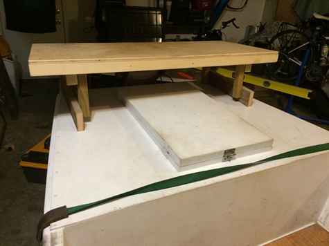 The bench sports a 1/2" birch ply top with 2x2s on the forward and aft edges for stiffness. Naturally, the top has a slight taper fore to aft to accommodate the angles of the boat. The legs are four 2x2 posts extending down to a fore to aft foot board on each side which allows for easy level adjustment. (Note the yellow circle in above photo)