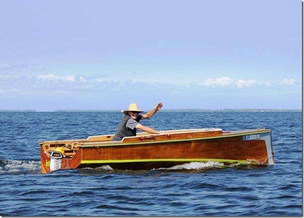 Jay Bliss is getting a lot of use from this funny looking hull he built. I keep telling him that it's upside down. First it was a big sailboat, then he cut off about four feet and made a smaller sailboat and now it's a high speed electric boat. I suppose next we'll see him pulling water skiers behind it, it's really time he made a new hull; I'm sure it'll be even stranger and faster than this one.