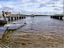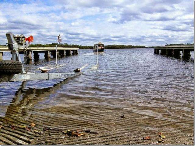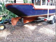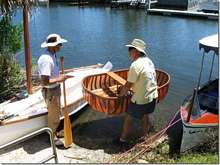 This beautiful black boat is Kevin's Cortez melonseed. He tells me that the whole boat will be black and even have a black sail. This is a great view of the shape of these boats. If you could look straight down on my "Helen Marie" you'd see exactly the same shape since she's this same hull blown up by about 25%. Steve got this picture of us launching her at the local ramp. All I do is crank up and back off the trailer.