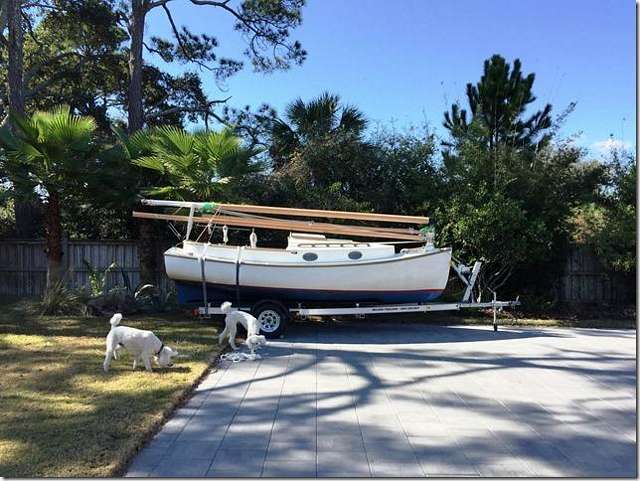 Here's the "smelling like a rose" award of the year. This boat was out in the woods behind a run down shack completely overgrown and blocked in by small trees. Fland's friend told him that he could have it if he could get it out. After lots of chopping and chain sawing here it is all cleaned up. This is a Marshall Sanderling, for the last 50 years one of the prettiest 18 foot catboat around. I thought Texas Jim got a super deal when he stole his from a little old lady but this one takes it, unless there were snakes involved in getting it out.