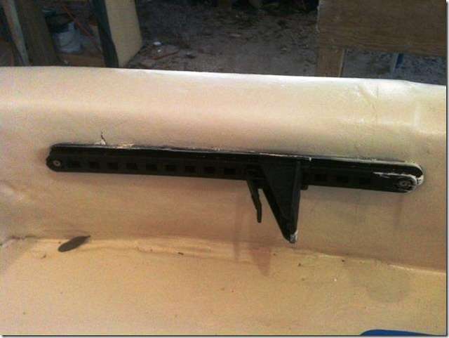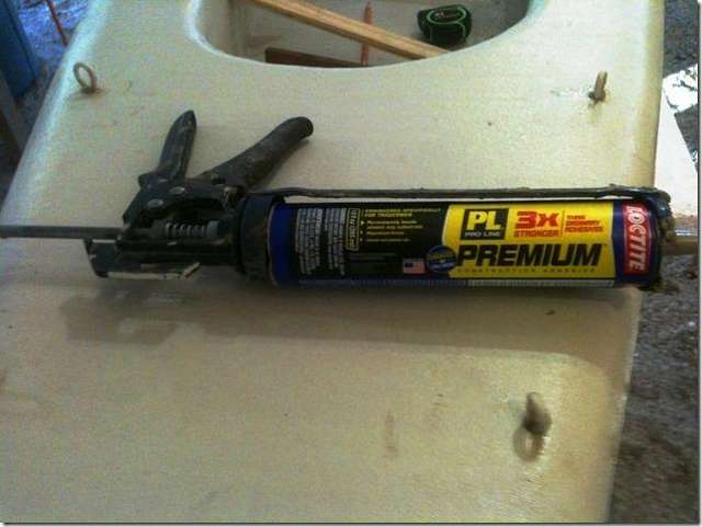 How do we attach handles and foot pegs and such on foam? PL premium 3X of course. You just make a hole larger than needed, fill it with PL, stick in the attachment and let it harden. This stuff expands a little and makes a really solid connection. As I've told you before, we use this stuff for ALL of our gluing applications. We never use epoxy to attach anything to anything. Epoxy is for glassing and fairing.