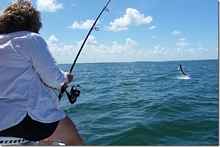 Here's Kathy with a tarpon on or as they're known here, shark bait. It's almost impossible to land a tarpon without a big shark getting it. Lance got this big 'cuda when they went a little farther offshore.
