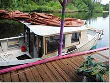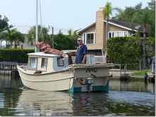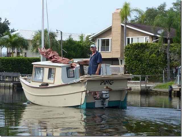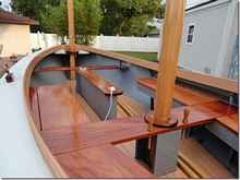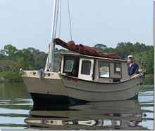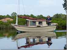 Stan's "Junk" is really a perfect boat for you guys who want a small comfortable overnighter. "Ping" is only 16 feet long but has a big bed and steering inside and out and sails very well with it's Beetle Cat sail.