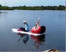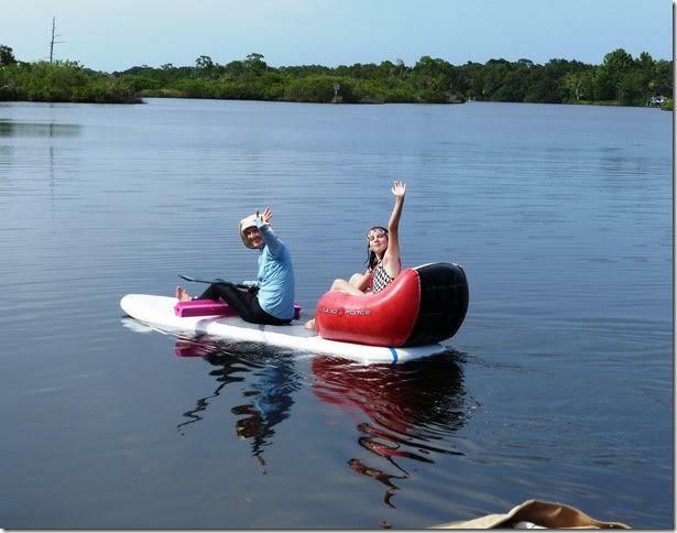 Laylah, Norma Ann and Cessna spend every hour they can in the water playing with the Manatees. Our river lagoon here has a sand bottom only about four feet deep with clear water and animals to play with. Our boats are open to any of you who want to come by and play. This foam board that Steve made is the most popular.