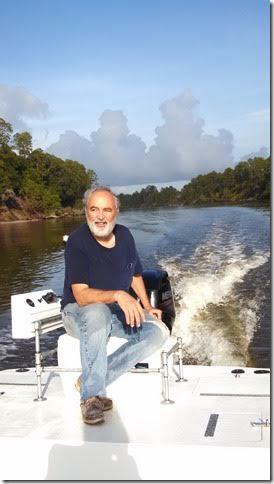 Here's Dan Houston with the giant John boat I told you about last time. Here's a man who knows exactly what he wants. Check out the controls on the pedestal next to his cooler seat. A large outboard with tiller steering. You notice that there are a lot of us who think like this. Pat Johnson with his covered launch, Stan and his Junk, Chuck and his no telling what boats; in fact most of you on this list are like that. We like boats that are somewhat unique to say the least.
