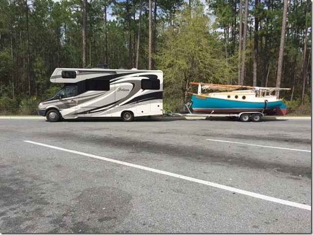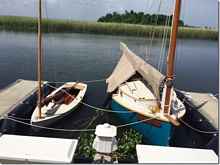 Judy Blue Eyes packed up her boats and moved from Charleston to Apalachicola and says that she loves it there. The big one is Sweet Pea, the Fenwick Williams 18 Catboat that Howard made here at our shop. Judy has done a ton of work to put it in tip top shape, way better than we ever did. The small Melonseed is "Freedom" the one that master builder Mark Bayne built for her and I modified so she could handle it easier in shallow water and from a dock. A sprit rigged dagger board boat is not what she needed in these waters so I turned it into a gaff rigged centerboarder with all lines running back under the deck to the cockpit . She says that she goes sailing at least twice a week and has made lots of friends there. Sweet Pea always looked big but this shot of it on it's trailer shows that she's really only 18 feet long.