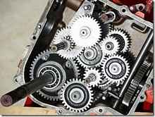 Howard decided to fix the high range on the Gravely tractor. This is it's gear case. He's removed all of these gears and more and is putting them back now.