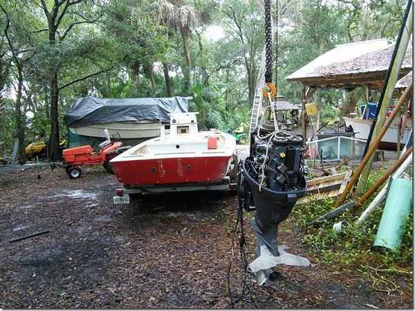 Howard's Texas Sled got it's motor pulled and is headed to the dump. This is a good example of how you can't let boats just sit unused. This was a beautiful boat, plywood and glassed all over but it sat covered but unused for about five years, you've probably noticed that some of us like to make um but not use um. This one was in the water three times for a total of about two hours. And it had a lot of sealed compartments that accumulated moisture which as you know will find it's way into microscopic openings. The hull is now a giant rotten mess. The motor is getting switched over to a Boston Whaler.