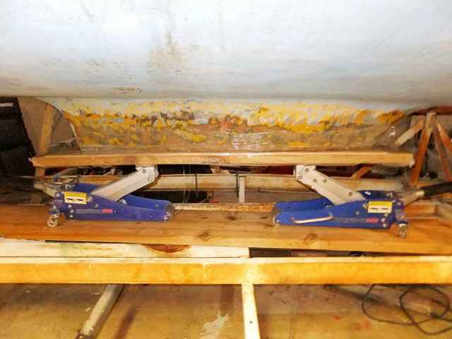 My supply of cutting wheels and grinding discs had also migrated to the detritus on the floor. The whole idea was to get Miss Kathleen lower to the ground, now that a once-deep keel has been reduced to a vestigial stub. And, I hasten to add, that particular process of cauterizing that rather gaping wound was accomplished from the same ergonomically challenged perch(s) from under the hull and inside the trailer frame as the cutting and grinding of last night’s Masochism Tango.