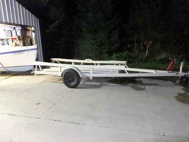I’ll try to get the Kathleen project back on track, without further masochisitic tendencies displayed. We’re a long long way from being done. But after the night shift, tonight, I can report that the trailer is painted, and the bunks & keel platform are close to the right position and shape. Close.