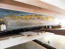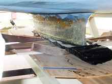 Back to the barn. And, back to the drawing table. It was running pretty solidly from someplace in the toe of the keel stub. Outa’ sight behind a rotted old plywood partial bulkhead. Up where I kinda’ wondered about when I was splayed uncomfortably under the trailer frame attempting to glop ‘pox and heavy bi-ax cloth into a keel bottom shoe. Up there, someplace.