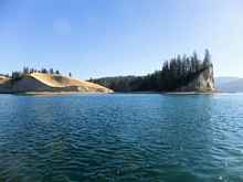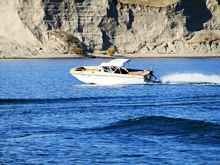 Phil and I were talking about just that while having dinner at Hunters’ one and only evening-eatery. The Hunters Inn is the local dive. But, they sell beer and food. And, we were both tired of what comes out of a can. So, up the hill and across the mesa from our quite-deserted campground. We had already been out on the lake scouting anchorages and beach camping spots much of the afternoon. And, there’s a half-bazillion of ‘em out there. Some of them look like this.