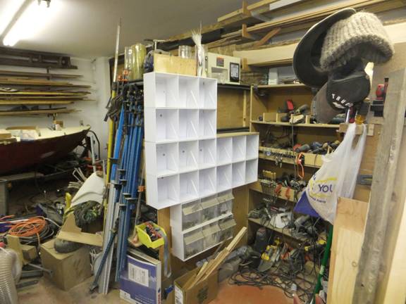 The old power tool bay now has fasteners in tilt-out bins, and will soon also have cans of bigger/heavier stuff on the opposite shelves. You know, stuff like trailer bolts, and deck cleats, and odd bits of hardware and electrical devices. The sort of thing that accumulates in EVERY workshop.