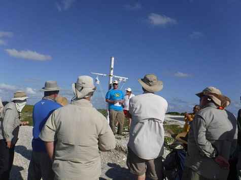 Jumping out of the skiff and into the shallow waters of the tiny islands beach, the cross, made of an anchored mast dominated the point's horizon with three flying burgees, one for each man being honored, each with the skipper's name emblazed. Stark against the sky, the cross seemed the perfect memorial, perfectly placed and silhouetted.