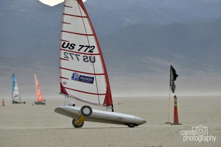 During the mid 80's I got the itch again for landsailing. I built my first boat out of plywood and made it more similar to an iceboat than a dirtboat. After a few years of racing and modifications I ended up winning my class at the Annual America's Landsailing Cup held every spring at Ivanpah Dry Lake at Stateline near Las Vegas.