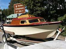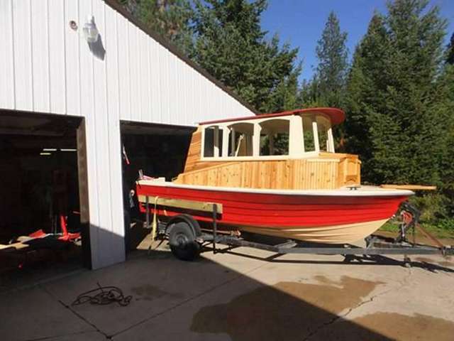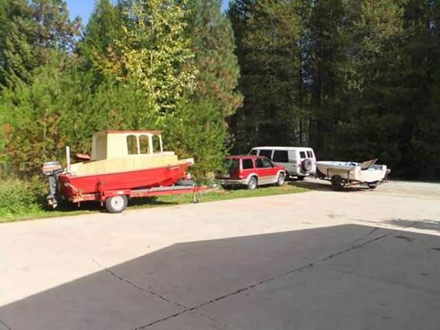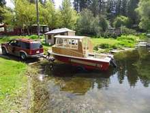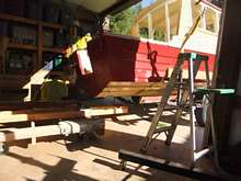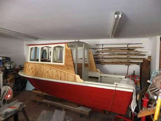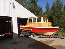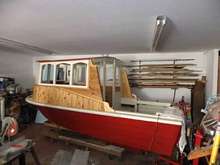 Roughneck came home from storage, got lifted off her trailer and rolled back into the shop. She's gonna' get a tug boat fantail, and a "nose job" and probably the rest of her interior while the snow flies.
