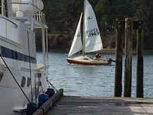 The only boat to brave the breezy conditions in Jarrell Cove during a break in the clouds. "Lady Bug" still knows her stuff, but the skipper was a bit stiffer, and less agile than in years gone by.