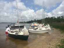 I had just about exhausted every possible curse that I could call upon the spirits of wind and sea when I heard and unexpected “clank” and a splash. The hours of pounding had loosened the anchor mount on the bow pulpit and the anchor had fallen off! Bandit sharply spun and wallowed in the chop as the anchor took hold. This provided my first opportunity to scramble onto Bandit’s tiny foredeck while underway. Several exciting moments followed while I lowered sails and hauled in the anchor which had seemingly dug it’s way to China in the heavy mud. After what seemed forever, and which was actually about 10 minutes, I managed to get underway again, a bit shaken and out of breath but seemingly no worse for the wear.