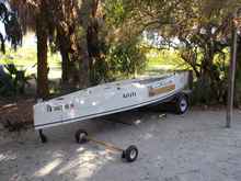 First, a word about Thang. John built it a couple years ago. It's his interpretation/adaption of the venerable International 110 sailboat - without the heavy iron keel. John's first sailboat was a International 110 he saw in Texas, eventually bought, and taught himself to sail in. Thang has about the same length and beam, at 20 feet and 3 feet 9 inches respectively, as a 110, but he took the rocker out of the bottom except for a little athwartships curve in the middle. The bottom is thick foam sandwiched between thin wood and fiberglassed on both sides, something John has done before.