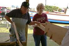 Frank Coletta (the same visionary just referred to) is one of the founders of the Festival, and after recent experience with a family boatbuilding event in another time and place, undertook to help five families (one of the original six families had to back out) do something they had not done before; build a boat. To facilitate this project, he was able to get a number of key sponsorships, charge a modest fee for materials, and enlist the help of some experienced and not-so-experienced boat builders as coaches. He also industriously turned the plans for Jim Michalak's QT Skiff into "kits" for the occasion; complete with bonded joints in the long pieces, filled knot holes, pre-cut parts (sometimes REALLY pre-cut; more on that later) and pre-assembled sides and chines.