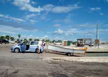 After a very long drive, we came to the end of the road at the Port Aransas Ferry Terminal. The Fit, even with "Goat" in tow, felt tiny next to the SUVs and pickup trucks that surrounded her. One short (free) ferry hop and we were deposited in Port Aransas.