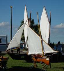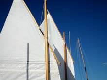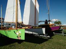Sails, sails, everywhere! In the foreground, a beautiful 12' cedar strip "Wee Rob" canoe sits in her cradle. Behind her, the sails of a 31' Bolger Folding Schooner loom large.