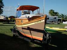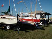 A Melonseed squeezes between two really neat mini-cruisers. The one with the red hull is a 15' CLC PocketShip. The white one is a 13' Polish design, called Sztrandus. Bob and Virgene Trygg did a fantastic job on this beautifully built Sztrandus, named "Bijou." This boat packs a remarkable amount of room for its size.