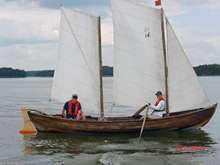 - Fredrik Koivusalo and Kristina's clinker gaff sloop Gna, a school-built replica of a traditional Enklinge julle. Enklinge is an island in the Eastern Åland archipelago. Fredrik told me that Gna is named, tongue in cheek, after Gna of Nordic mythology - the goddess of fullness and a fast harbinger for the other gods. Gna has slot-in splashboards to increase freeboard either side of the rowlocks.