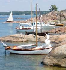 The wind, still from the east, was quite fresh, but the daily conference had ambitiously decided on a course to the east. Rounding the island of Ulkoluoto Uto, we came into the Orvlaxfjärden, a long open stretch of water, with white caps appearing. Feeling the weight of wind, we tacked into a cove and reefed, while an obliging holiday swimmer held our bow for us.