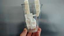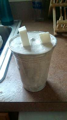 The first step in preparing the investment cast is to attach a couple pieces of foam to the part to act as a sprue (where you pour in the molten metal) and a riser (a place for metal to flow out the other side, so you know the mold cavity is properly filled).