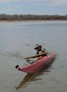An effective stroke with a Greenland paddle also differs from a euro paddle's stroke. With euro blades most of the power comes on quickly and fades as the paddle reaches the hips. The GP does not become effective until after the stroke has begun. The power comes on as the blade is about at the hips and remains until the paddle is lifted out of the water. It is interesting to note that since the blade is forwarded canted it provides forward propulsion even when lifted straight up at the end of the stroke. In short, the GP stroke should begin only when the blade is fully immersed, slowly at first and swept until the blade tip is behind the hips. This is pretty much the exact opposite of the euro paddle forward stroke.