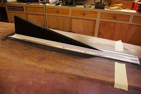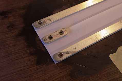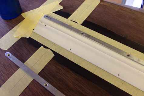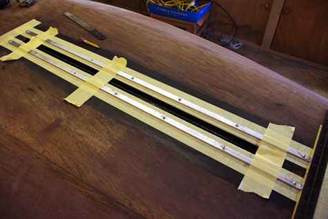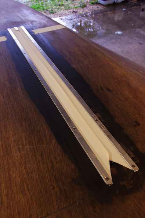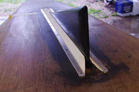 I started by marking out where the trunk logs are located and then marking those screws so I don't hit them when drilling for the gasket strips. I chose 1/2" aluminum strip that is 1/8" thick for the strips, and 1/2" X 6 stainless screws to hold them down. Of course part of the job was drilling and countersinking the aluminum strips for the screws - easy enough with the aluminum. The sail cloth was cut to 3-1/4" wide in my instance, and folded in half lengthwise to double it up. The fold goes to the inside of the slot. That puts the cut edges under the aluminum strips. I overlapped the gaskets about an 1/8" over each other in the center of the slot. At the back end of the slot the gaskets are cut at a 45 to leave a little triangle cutout there - the idea is that something of a venturi effect is created when the boat is moving to suck water out of the trunk. Even though the board went up and down with no binding whatsoever, I cut a small slot across the width of the slot at the front of the board to close up that gap a little when the board is deployed. The screw holes going through the sail cloth were made with the point of a nail heated up on a propane torch, and the sail cloth was cut with a new utility knife blade in my knife heated on the same torch. This is to seal the edges so they don't fray. I glued the sail cloth to itself where it is folded lengthwise so there is no space in between that fold that could balloon and fill with water and create unwanted drag.