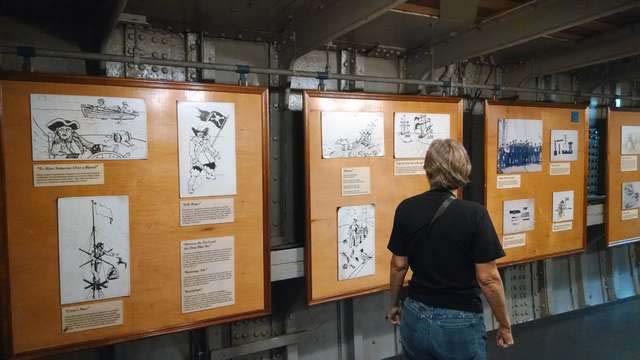 Back under the deck and into the "hold", now decked for displays. When the Elissa was sailing commercially, the hold space was maximized - holding as much cargo as possible to make each trip financially profitable. A large map shows the routes the boat took - Europe to South America. Several times around the Capes as well. The Elissa docked twice at Galveston during her long career, and this was one of the key points that led to her purchase and restoration - one of the requirements for her to be where she is today.