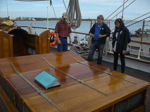 Long story short, he dropped by the workshop one day and got to talking with Carol, mentioned boats, she mentioned Duckworks, and we got an invitation for a personal tour of the Elissa. Chuck called Jamie soon after, and we had a date.