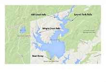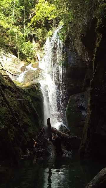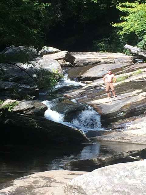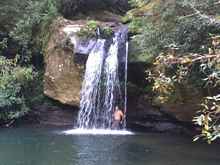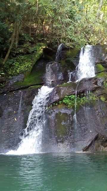 We next headed down the longer Northeasterly fork of the lake to see Laurel Fork Falls and Mill Creek Falls. The beauty of the lake did not disappoint despite being dominated by powerboats and prime shore spots being covered with easy-up day camps. You are not allowed to shore camp except for the boat-in campsite though sleeping on your boat is allowed. Still, for a holiday weekend the lake was relatively uncrowded especially compared to Hartwell which we passed on our drive to Jocassee. Despite being tucked in an unremarkable cove, Laurel Creek Falls was easy to find by watching the boat traffic. When we arrived there were a couple of boats around the cove and quite a few swimmers to avoid. I turned off the outboard and grabbled the canoe paddle which worked well on such a small boat. I was able to paddle our boat back into the very small grotto to get the full view of this beautiful waterfall.