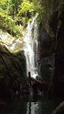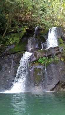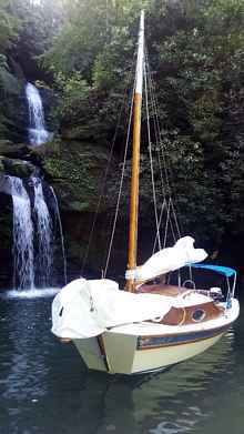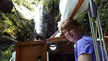 As we approached Wright Creek Falls I lowered sails and powered up the outboard. Once again, there was a couple of powerboats and a lot of swimmers in the water enjoying the cool breeze in the shade of the falls. These falls actually go over an overhanging ledge creating a natural rainfall shower that most people can’t resist getting under. Taking advantage of my paddle and the cuteness of my boat, I winded my way through the boats and parked my boat close to the falls much to the delight of the photographers in the crowd. At one point, I got out of the boat and stood on a rock as I scooted my boat, complete with worried wife onboard, towards the falls. She was worried I was going to move the boat under the falls - she knows me too well. Wanting to sleep on my own bed that night, I didn’t but I did take advantage of the situation to snap some photos. Afterwards, I tied the boat off to a convenient branch and went to try out the natural shower myself. I quickly discovered why the lake waters were so cold! These are mountain streams and my natural shower was eye openingly cold but very refreshing.
