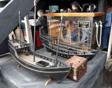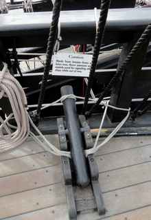 Some period details: a fender made of scrap rope. A sample of the ballast stone stored in the bilge, and the sea quadrant used for navigation. |