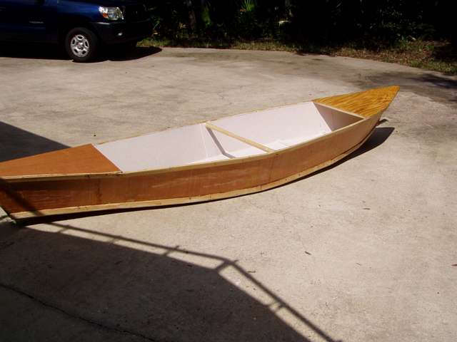 The sides and bottom are of Home Depot Lauan plywood. The stem is a 2 x 2. The transom is of heavy plywood. I was trying to keep the weight at a minimum plus I am very frugal and try to use what is available.