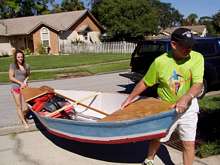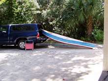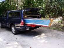 The first idea for transport, was on the roof of my truck. The idea of a Granpa lifting a 70-pound boat up on a roof is not appealing. So we stuffed a 12-foot boat in a 6 foot truck bed with the tailgate adding another foot.