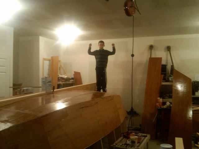 Hull sided with first layer of 1/4" plywood (double layered to 1/2" thickness, then fiberglassed over this). |