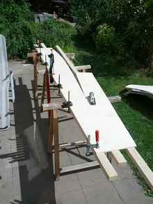 Then, I joined the middle panels to the shorter hull section for both sides. Used a two-sided glass tape butt joint. True to the "all cheap" philosophy mentioned above, I used drywall glass tape for the butt joints as well as for the reinforcement patches. The stuff is nice and flat, cuts with scissors like paper but is fairly stiff. I am curious to see how it will work on curved fillets. For curing, I stacked all parts flat, with non-stick plastic sheets between the epoxied spots. Put a few concrete garden path blocks on top for some pressure. My wife did get to see the stack on our living room floor and was surprisingly relaxed about it(!).